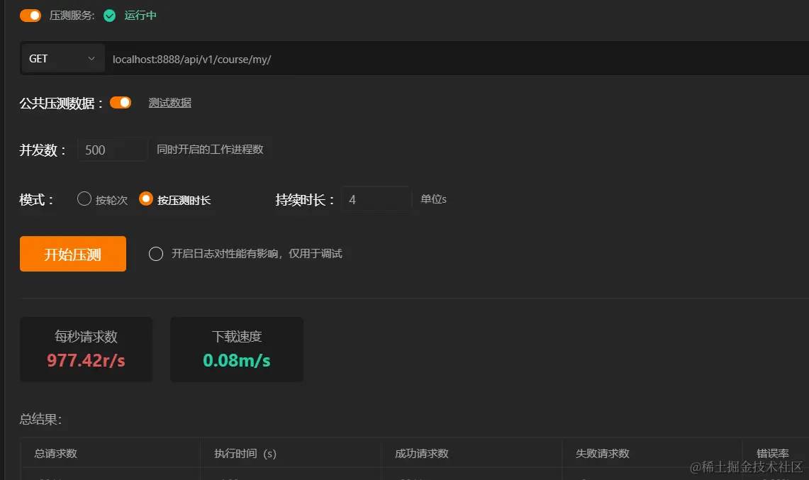 这里我们进行模拟500个用户进行持续4秒请求,看查看Gorutine数量是否会进行变化