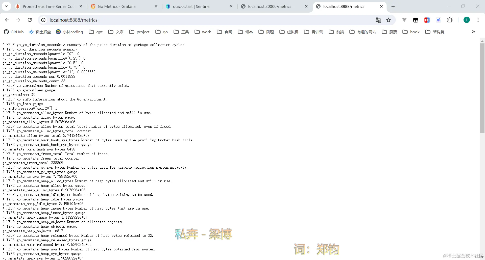 这样一来我们就能进行收集到当前服务的一些信息了,接下来让我们看一下localhost:20000/metrics。
