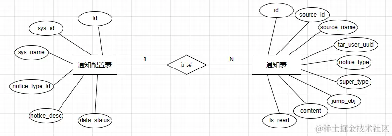 概念模型使用 E-R 图来表示,其中 notification 与 notification_config 为1对多的关系,且下面为了便于描述,只给出关键字段,其它字段可以作为冗余。