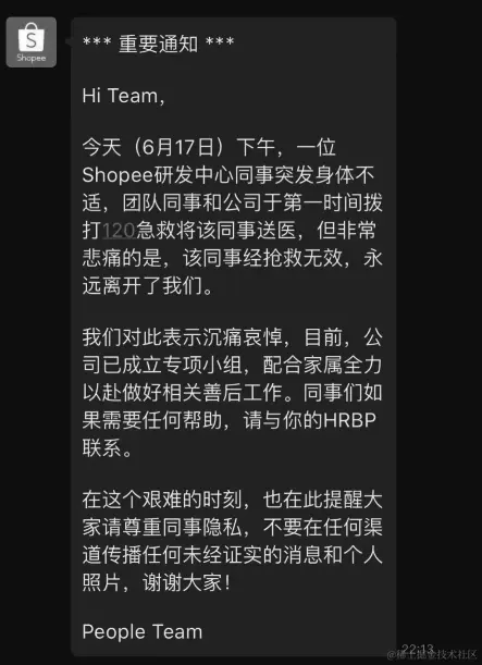 同一天下午,一名 Shopee(跨境电商)深圳研发中心的同事突发不适,也是经抢救后无效,Shopee 于当天晚上 22 点内部通报此事。