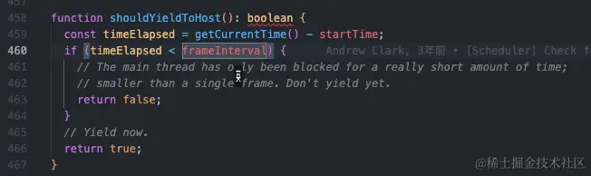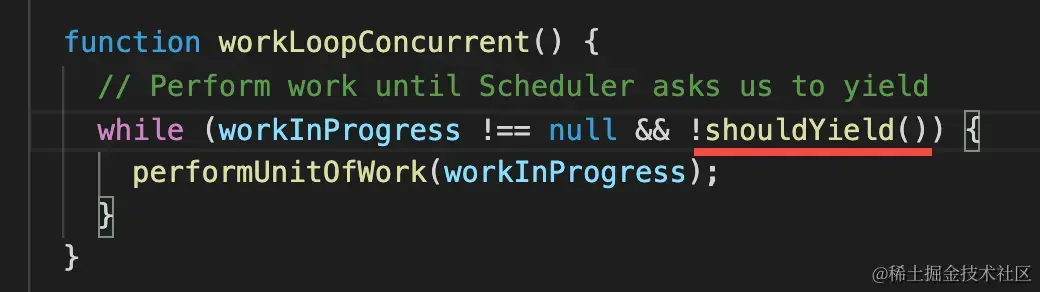 我们可以看见,更新工作从递归变成了可以中断的循环过程。每次循环都会调用shouldYield判断当前是否有剩余时间。