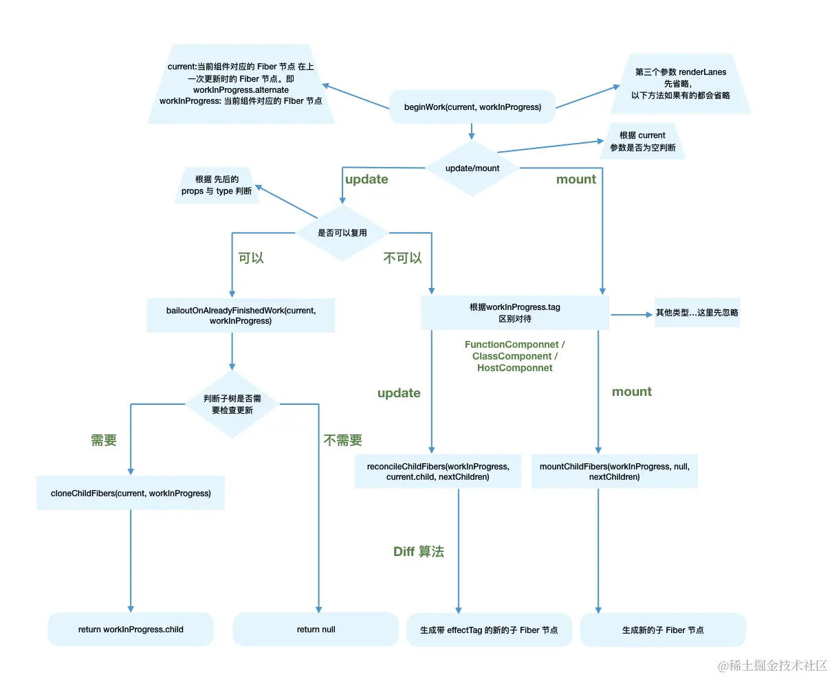 当普通的 JSX 代码被 babel 编译成 React.createElement 的形式后,最终会走到beginWork 这个方法中。进行 fiber 节点的创建/更新。