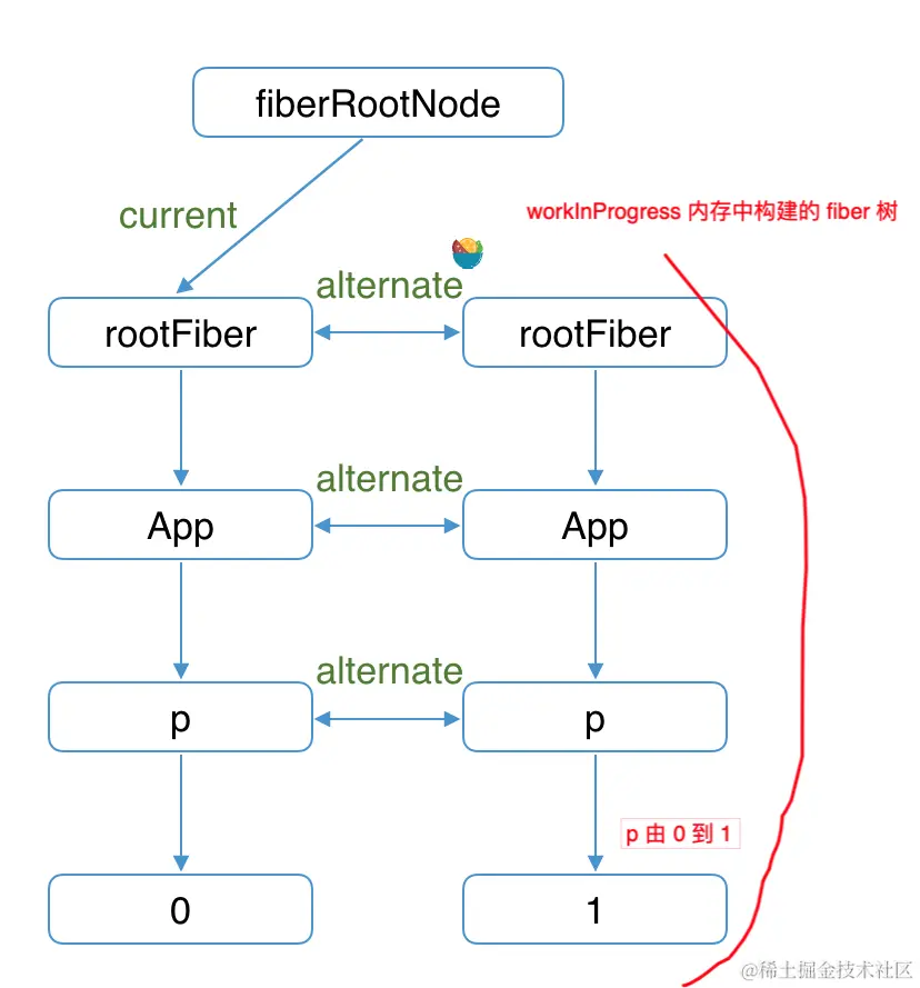 current Fiber树中的Fiber节点被称为current fiber,workInProgress Fiber树中的Fiber节点被称为workInProgress fiber,他们通过alternate属性连接。
