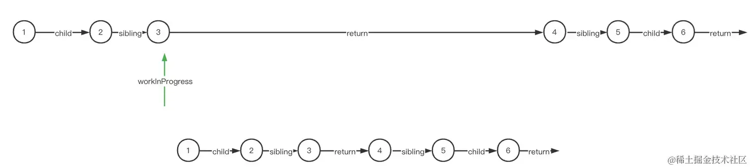 同级的Fiber节点是由sibling指针链接形成的单链表,即不支持双指针遍历。