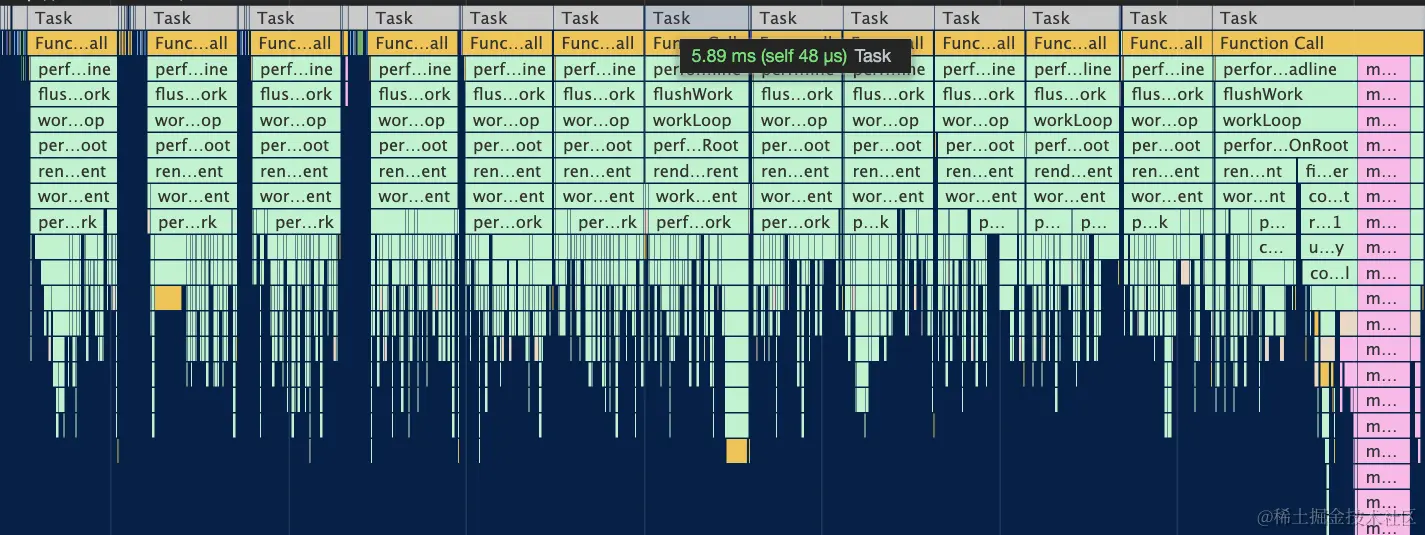 而 React 是将任务进行拆解,然后放到 requestIdleCallback 中执行。比如一个 300ms 的更新,拆解为 6 个 50ms 的更新,然后放到 requestIdleCallback 中,如果一帧之内有剩余就会去执行,这样的话更新一直在继续,也可以达到交互的效果。