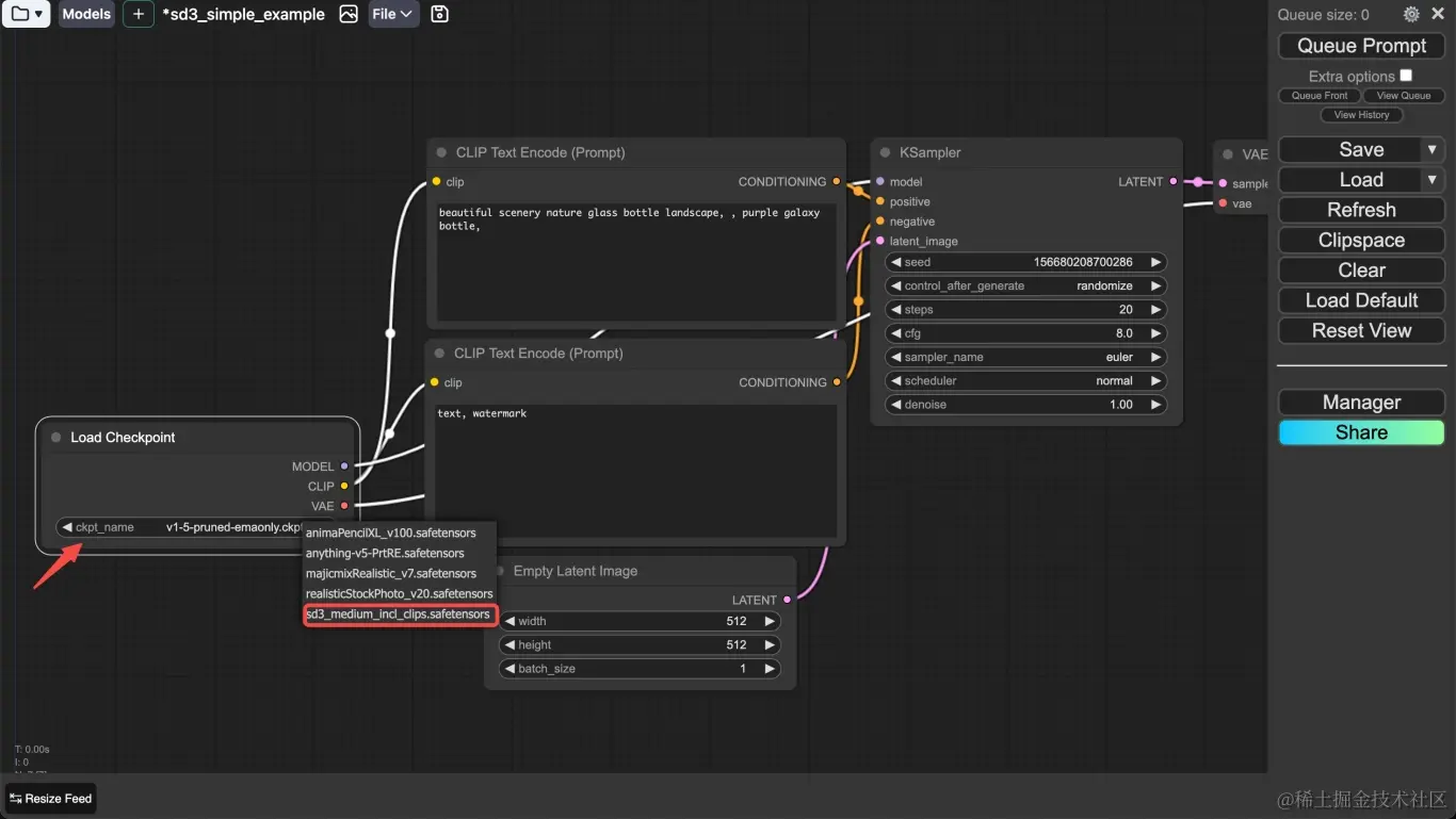 第三步:在Load Checkpoint 模块中选择 skpt_name: sd3_medium_incl_clips.safetensors这个选项。