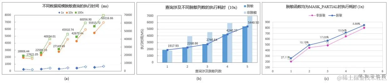 为了佐证上述猜测,我们调整脱敏函数,所有脱敏列均采用MASK_PARTIAL对原始数据做部分脱敏,从而能够在脱敏结果上保留原始数据的外部可读性。于是,如图©所示,当脱敏列均关联部分脱敏函数时,带有数据脱敏的语句比原始语句劣化10%左右,理论上讲,这种劣化是在可接受范围的。上述测试仅针对简单的查询语句,当语句复杂到带有聚集函数或复杂表达式运算时,可能这种性能劣化会更明显。