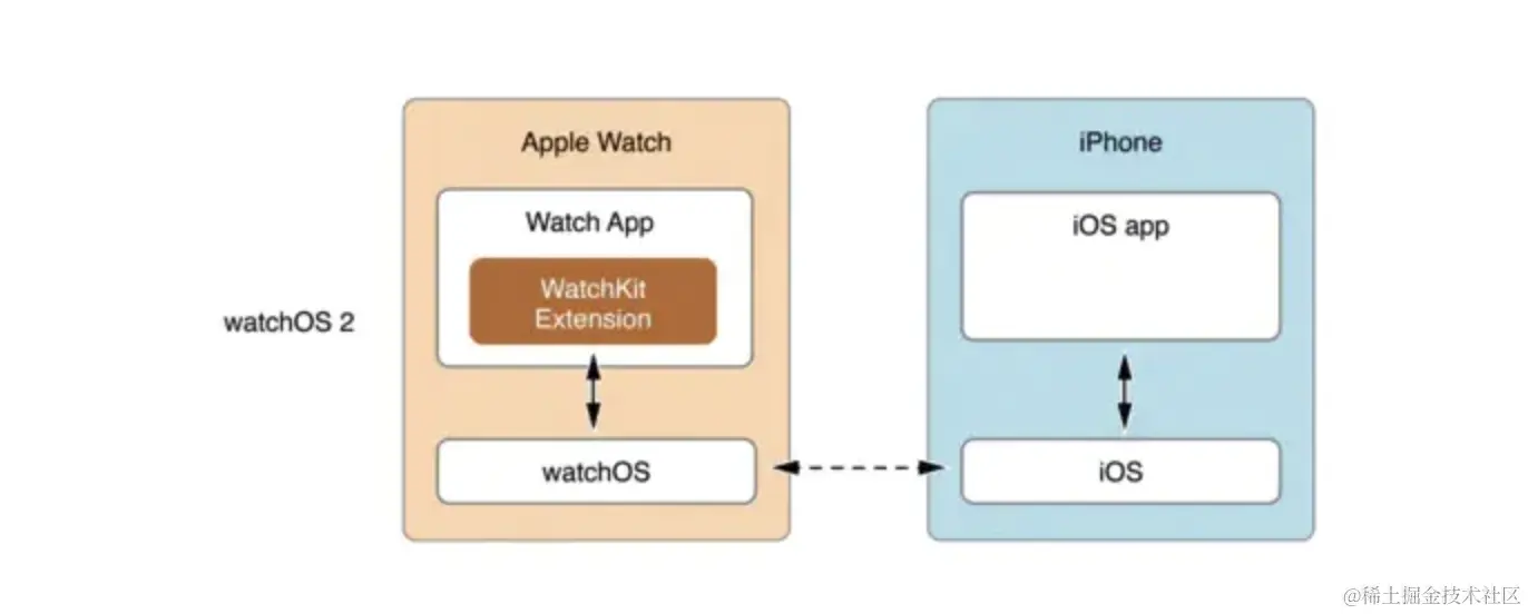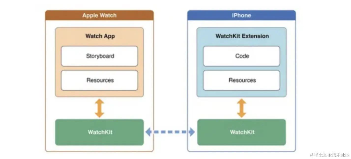 在WatchOS 2 之前, WatchKit App负责展示,安装在Watch上,WatchKit Extension负责业务和控制逻辑,安装在iPhone上。所有运算、逻辑以及控制都是在iPhone上完成。Watch app和iPhone app是通过Watchkit进行桥接的,所有的代码执行逻辑方面都是在iPhone上运行的,storyboard和图片资源在Watch端显示的,并且Watch app的安装运行都是由iPhone控制的。