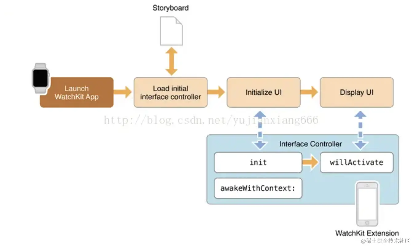 上图是Watch app加载的一个过程,可以看出Watch app的加载是依靠iPhone来进行的,启动app,加载Watch端的storyboard和图片等资源,然后会初始化UI,这个时候就走到iPhone端扩展里的初始化方法了,初始化完了之后就是显示UI,UI中的触发的动作都是去iPhone扩展里调用代码,将执行结果显示到Watch上。