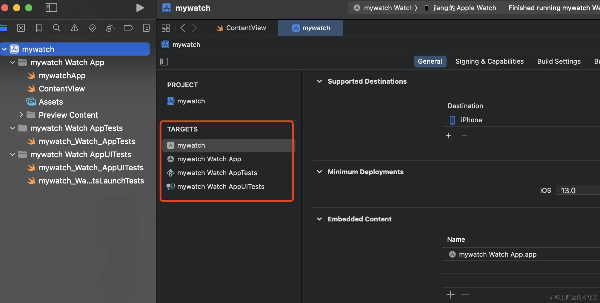 这时,会出现两个target:Watch App、Watch Extension。