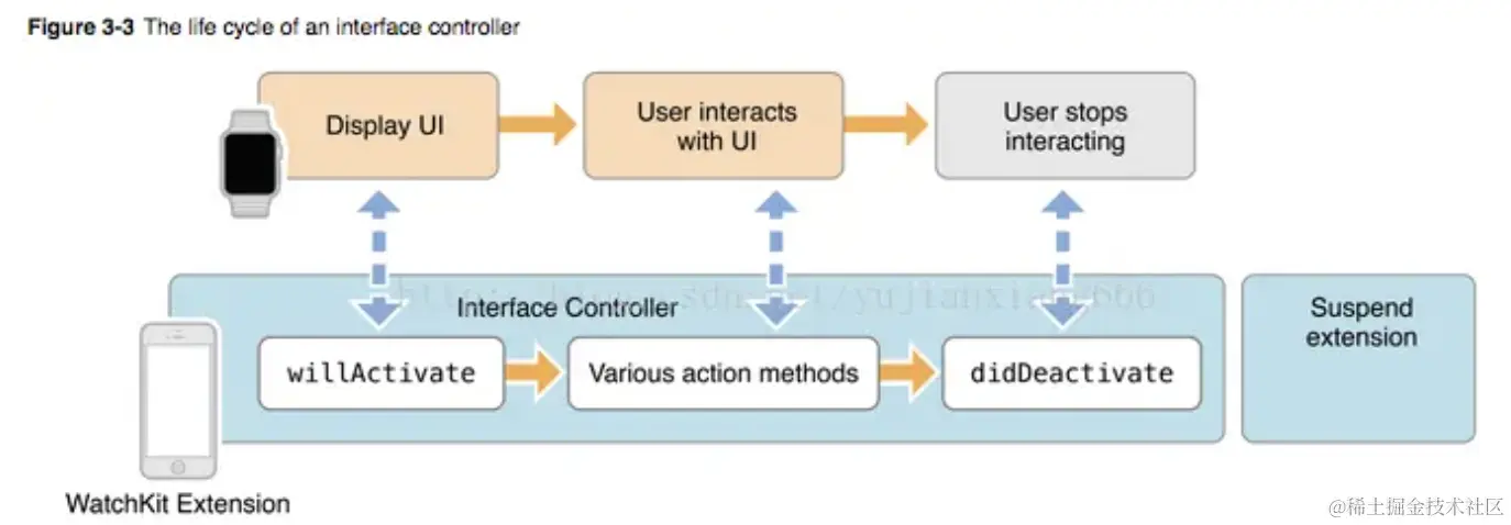 iPhone上app都有各自的生命周期,那么Watch app的生命周期呢,从上图我们就可以很直观的看到,从显示UI、用户交互到app结束,每一步都和iPhone对应app的扩展密切交流