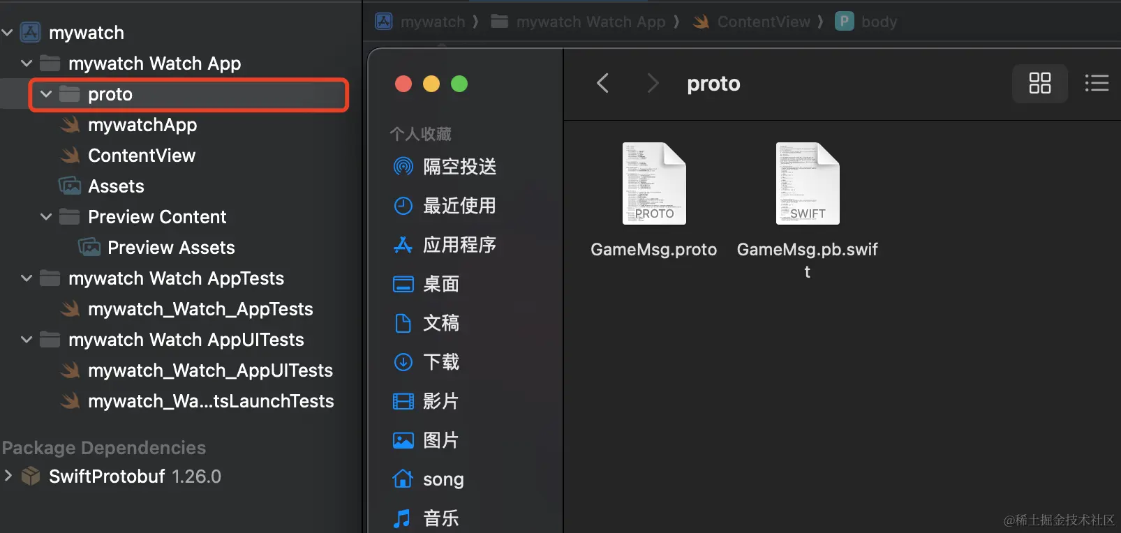 1.如果你在finder中在proto文件夹中生成swift代码,但是当你会到xcode总,发现proto文件夹中不一定会显示proto文件和生成的swift文件: