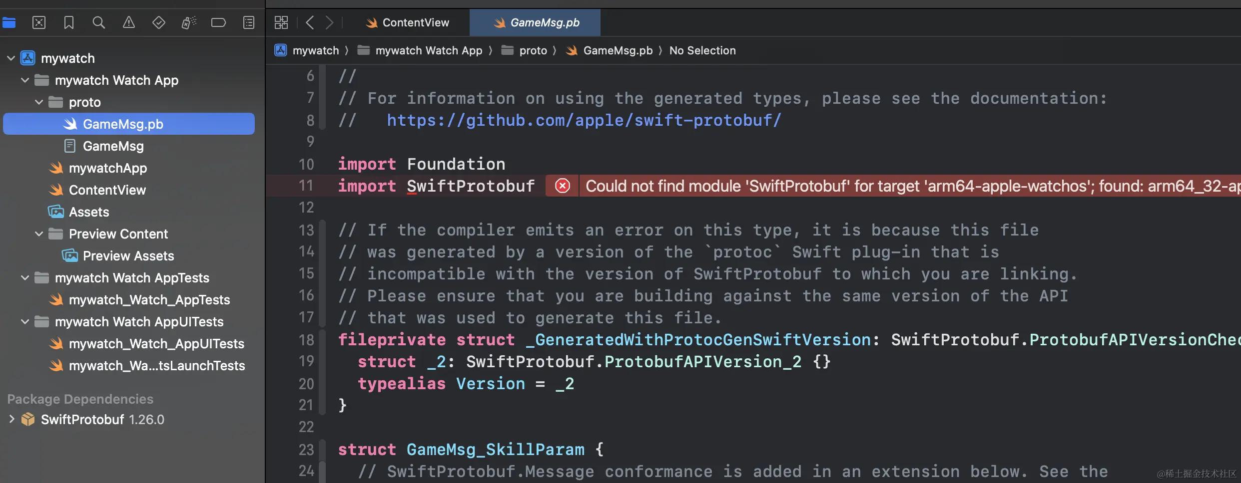 Could not find module 'SwiftProtobuf' for target 'arm64-apple-watchos'; found: arm64_32-apple-watchos, at: /Users/song/Library/Developer/Xcode/DerivedData/mywatch-coaeflxmpfflredurreogfyfvbxz/Index.noindex/Build/Products/Debug-watchos/SwiftProtobuf.swiftmodule