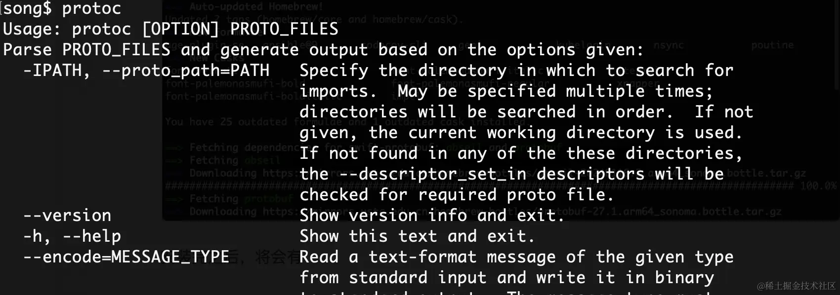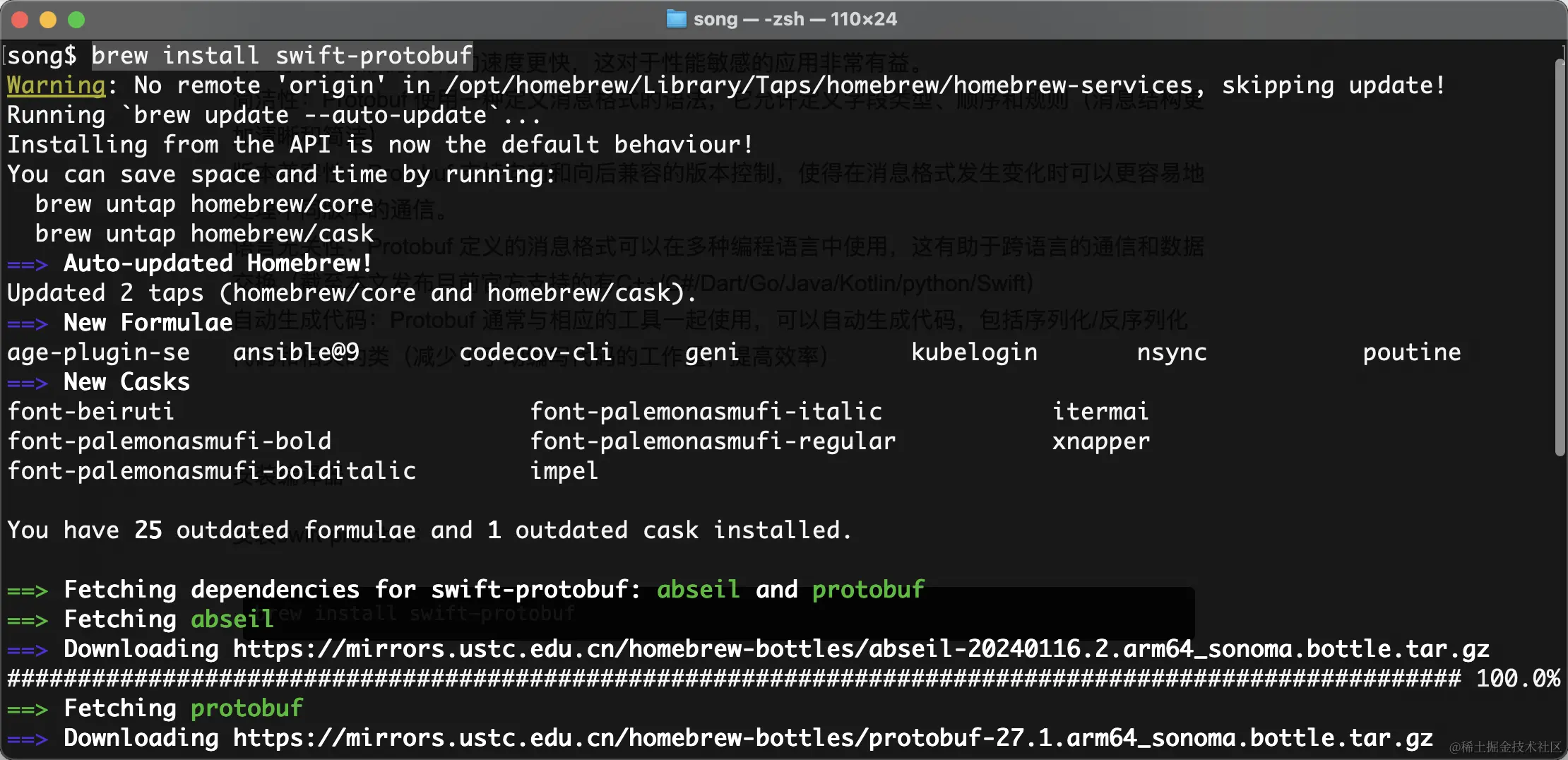安装swift-protobuf:这条命令将会给你的电脑上安装 protoc 和 Swift 代码生成器插件。