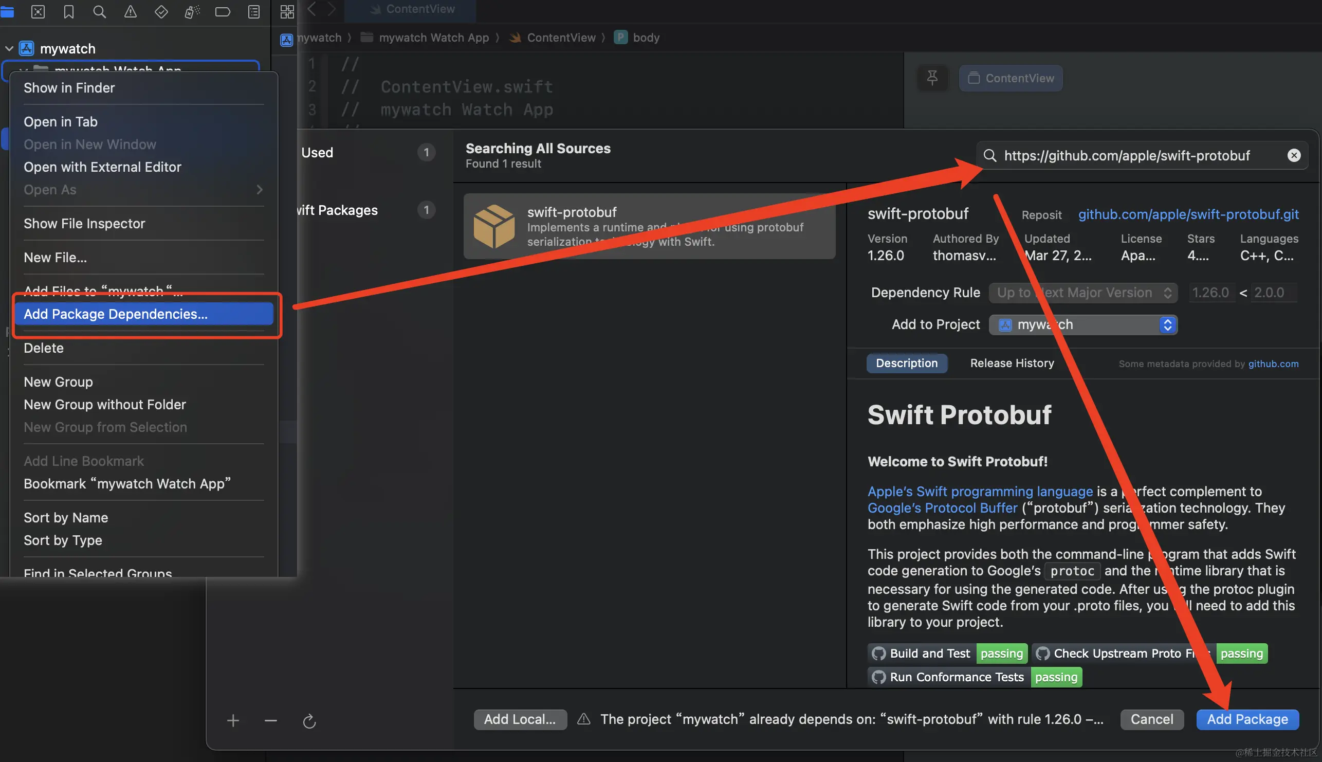 要想使用Protobuf还需要在你的项目中添加SwiftProtobuf,可以使用SPM添加或者使用CocoaPods添加,我这里习惯使用SPM,在xcode项目中可以直接右键添加包就可以了:
