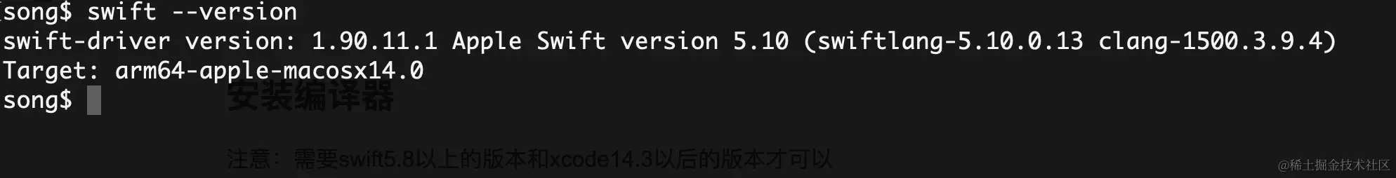 你也可以通过命令行使用 swift --version 命令来查看安装的Swift版本。这将会输出类似于下面的信息,显示当前安装的Swift编译器的版本: