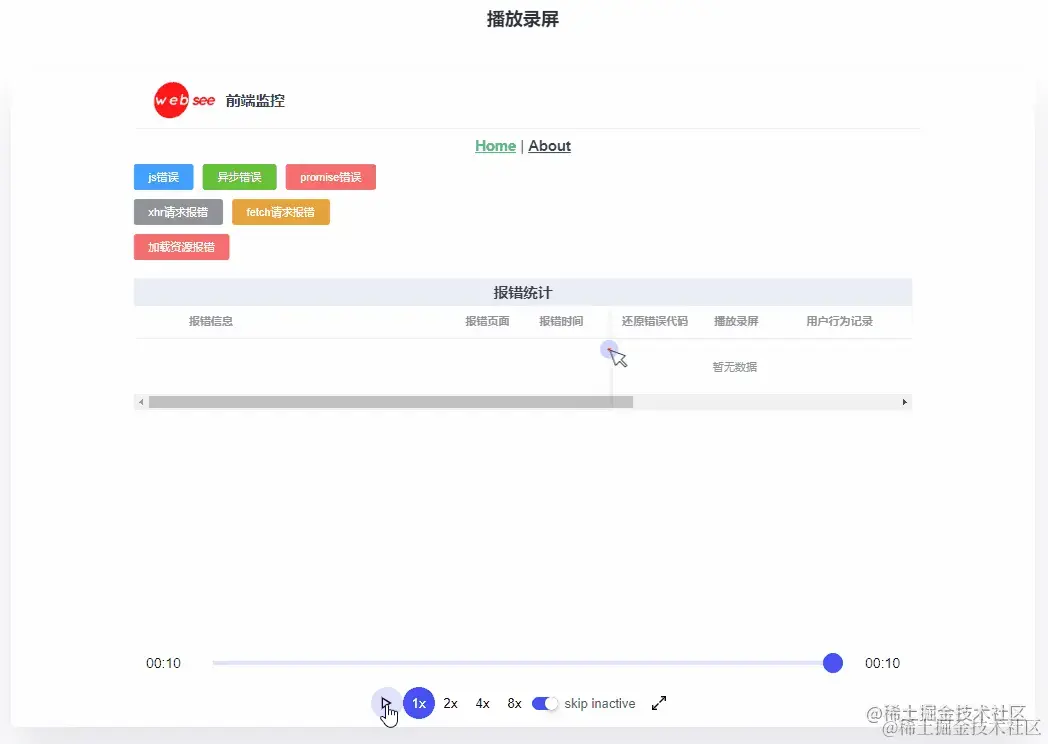 除了报错和性能,其实sentry还可以录制屏幕的信息,来更快的帮助开发者定位错误官方文档,sentry的错误录制其实主要依靠rrweb这个包实现