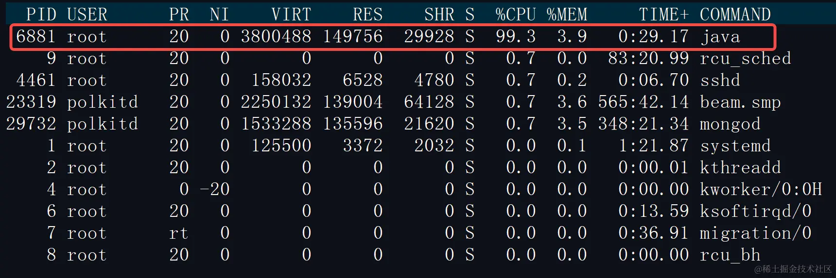 使用 top 命令查询 cpu 占用最高的进程 ID(PID),如下图所示: