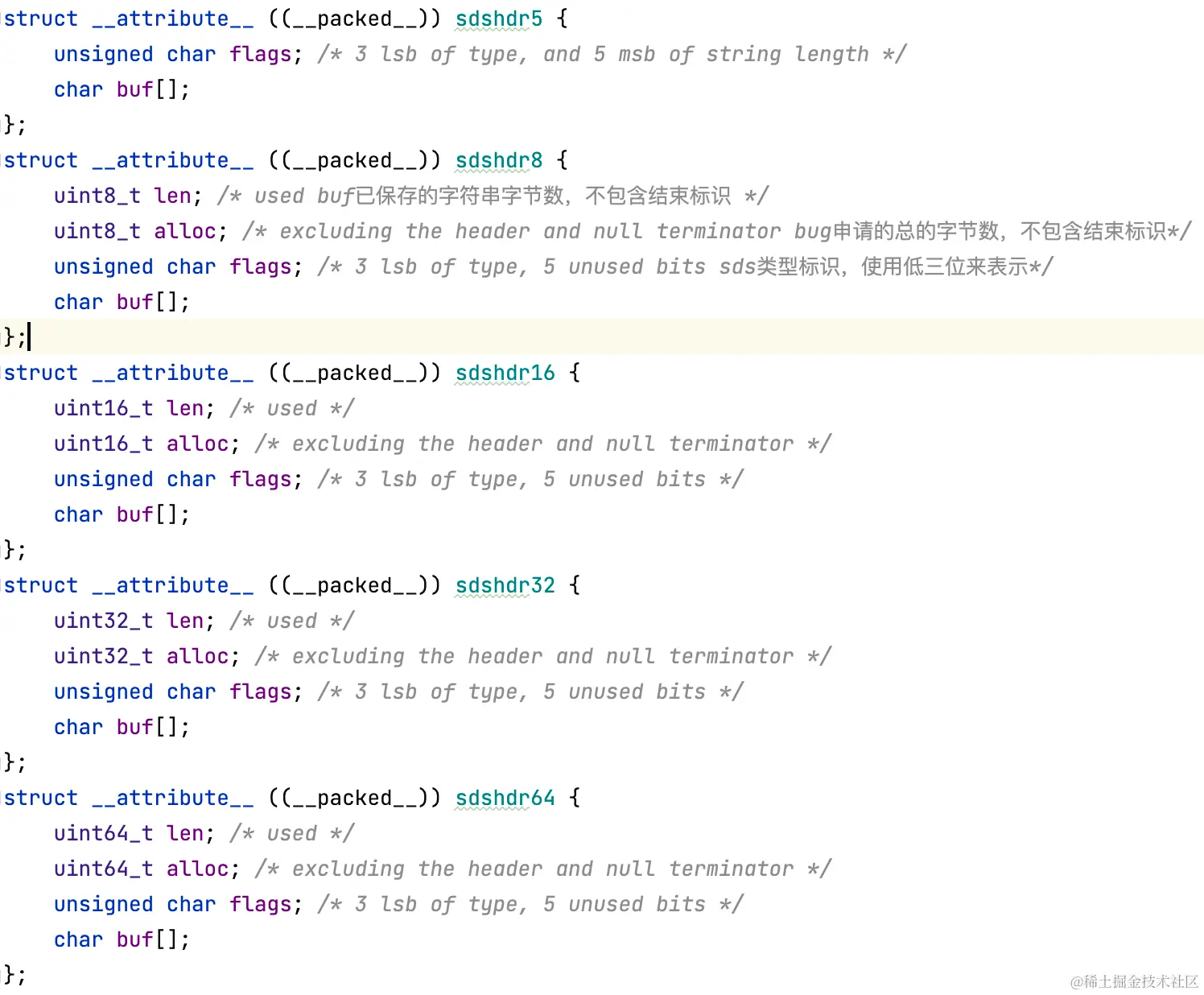 除了设计不同SDS的结构体来满足存储不同大小的字符串,Redis还在编程上使用了专门的编译优化来节省内存空间,我们可以看到每个SDS结构体的定义中都使用了__attribute__ ((__packed__)),以sdshdr8为例: