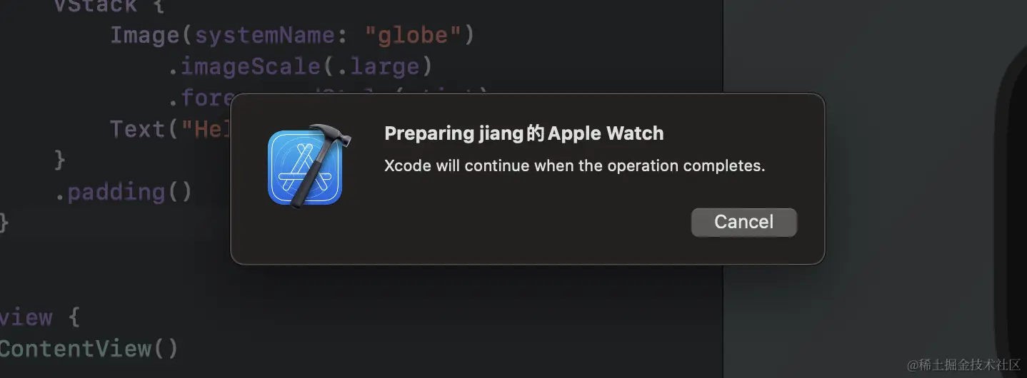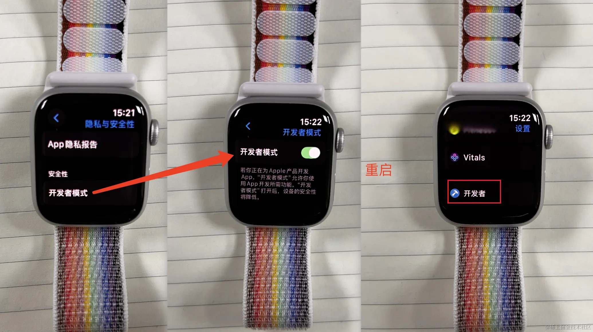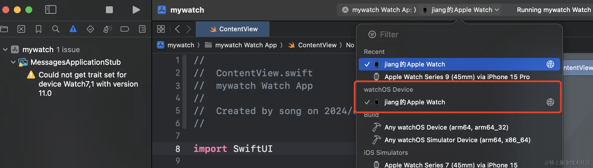 然后点击这个设备,就可以开始运行,第一次运行会提示你需要打开watch里面的设置 > 安全与隐私 > 开发者模式:
