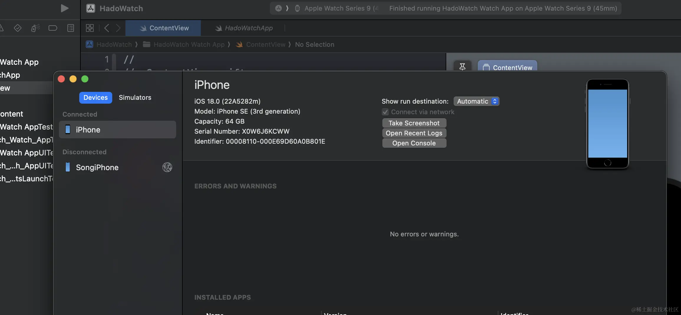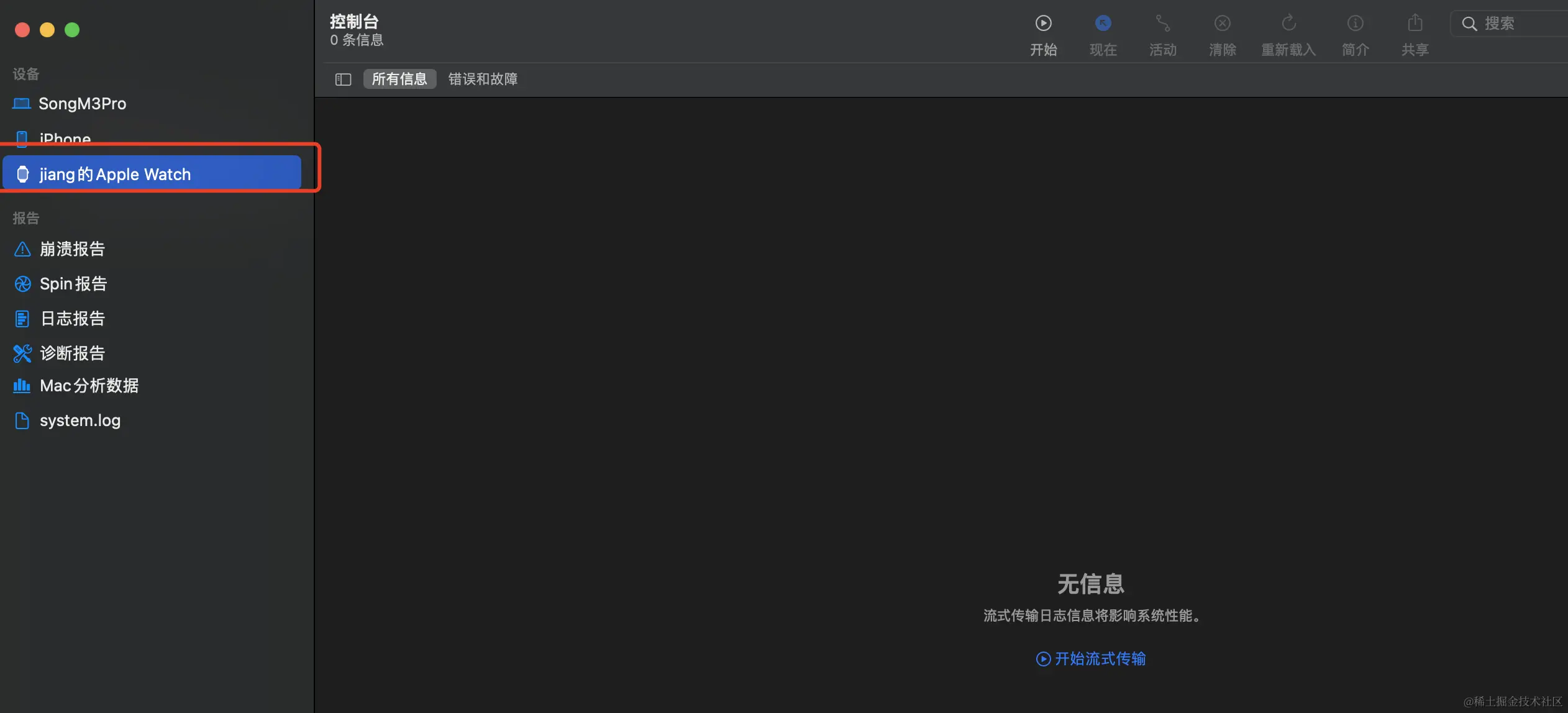 接下来,就到讲究人品的时候了,手机和watch都要关机重启(记得手机手表和电脑连接在同一个局域网中,如果手表重启后,可能会弹出信任此电脑,一定要点击信任),然后再打开设备看一下是否出现了你的watch,如果没有出现继续关机开机关机开机,嗯....就一直这样操作,或者手机关机,watch不关机试试,一直到设备这里出现了watch,说明就连接上了:这个过程耗时两天才搞出来开发者模式,还给apple watch的技术人员打电话,他们也不知打......