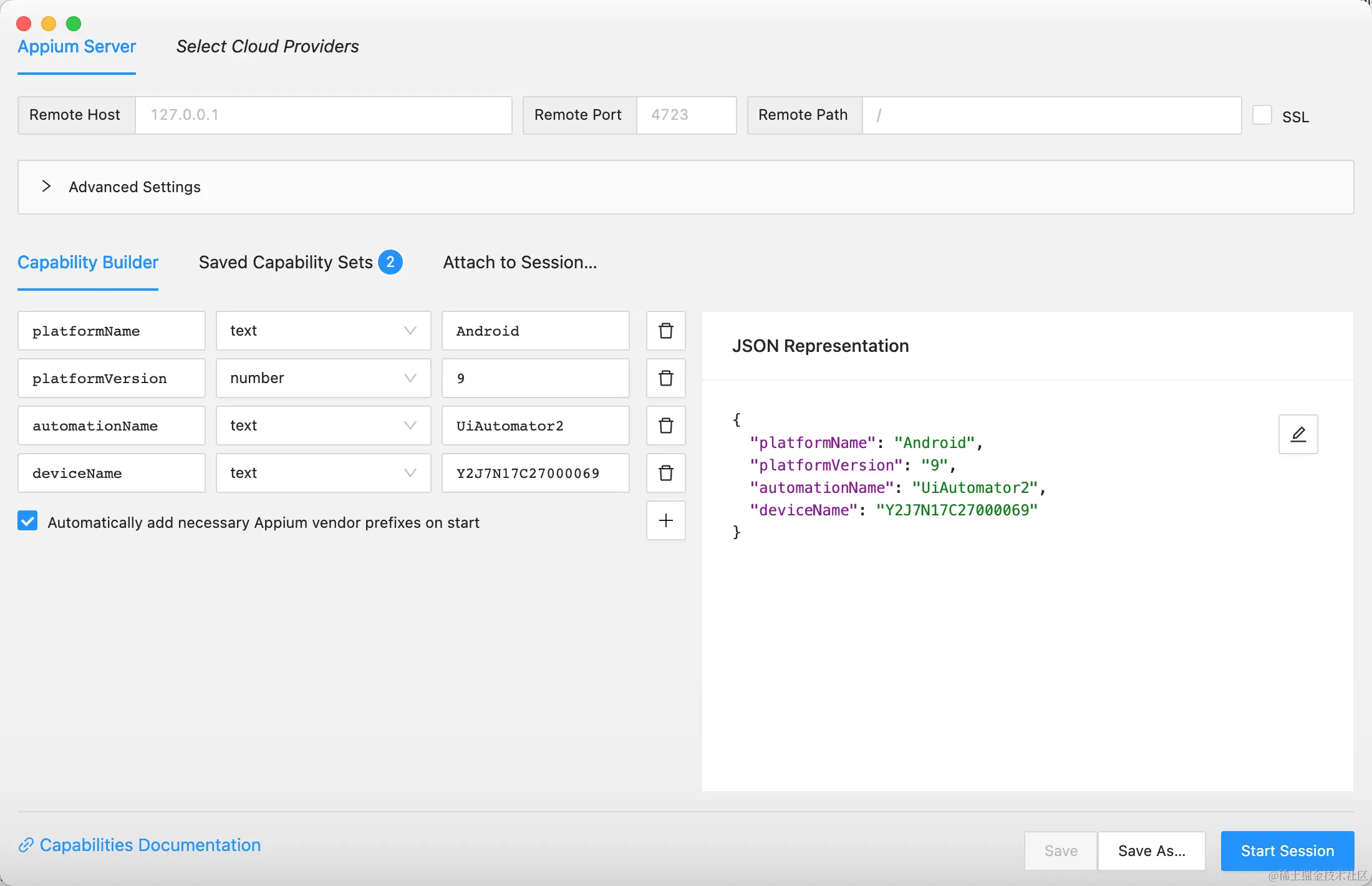 appium uiautomator2driver。 - 启动Appium inspector,配置好手机,然后点击