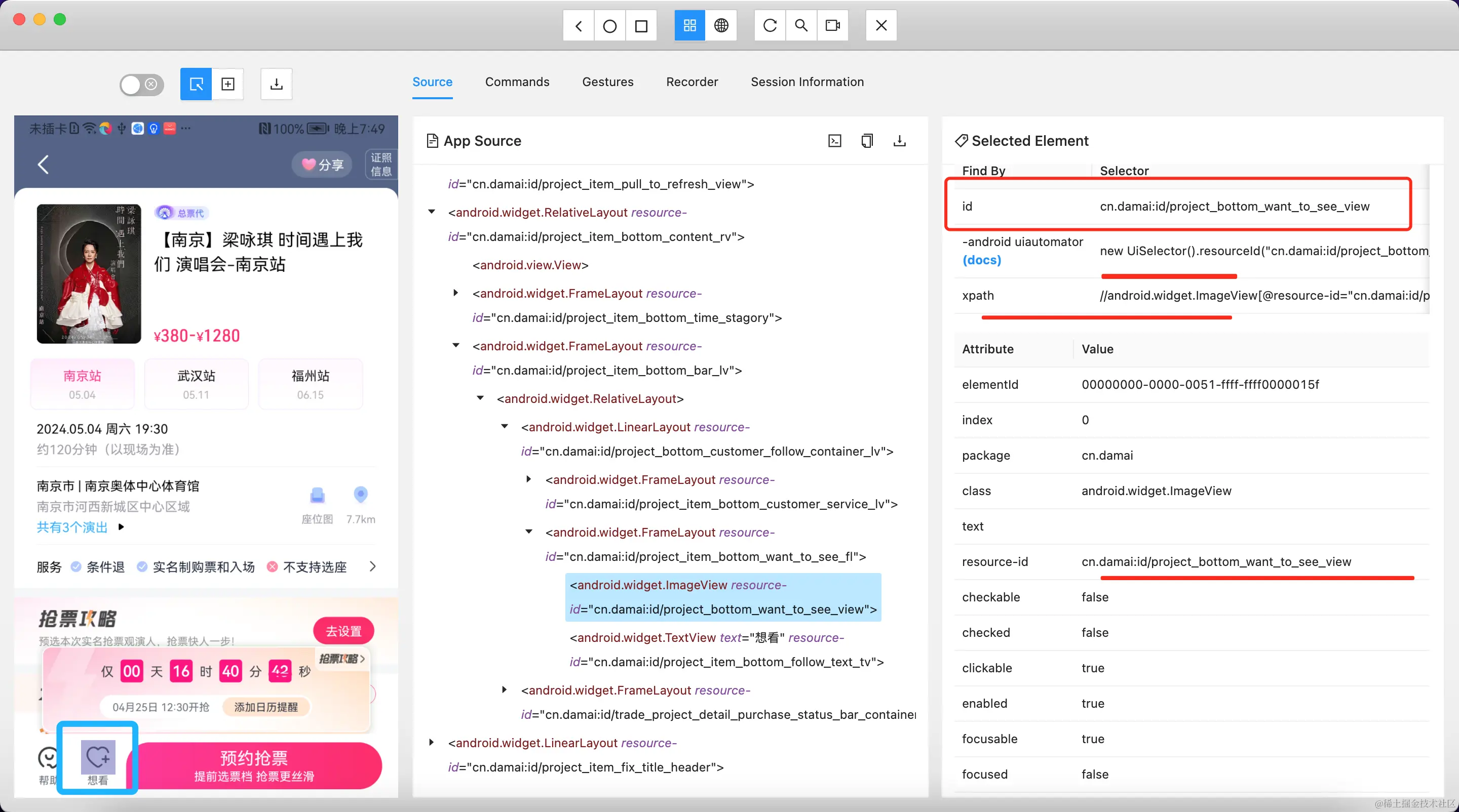 - 通过Appium inspector查看页面布局和元素,找出目标元素。