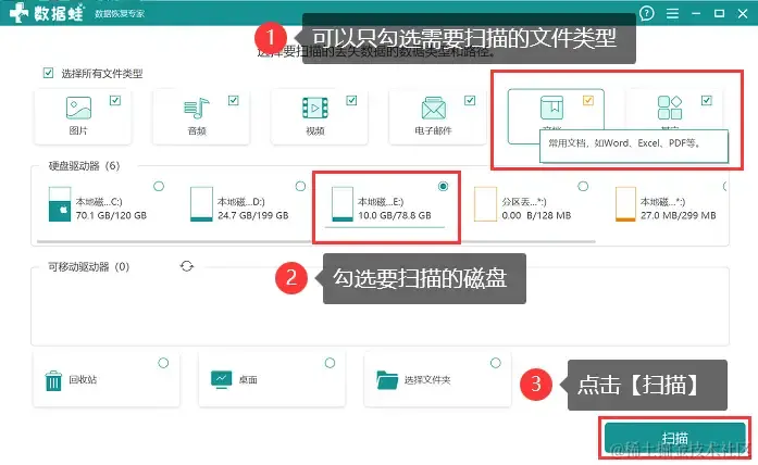 步骤2:根据需求,如果需要恢复某一类型文件,可以只将其勾选上,也可以选择所有文件类型,同时将需要扫描的磁盘或具体文件夹选择上,点击【扫描】;