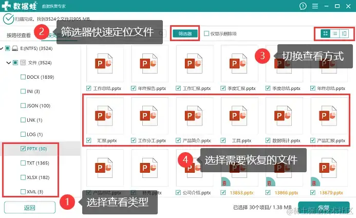 步骤3:软件进行完快速扫描后会自动进行深度扫描,可以等待深度扫描完成,选择合适的查看方式,并对所需恢复文件进行勾选;