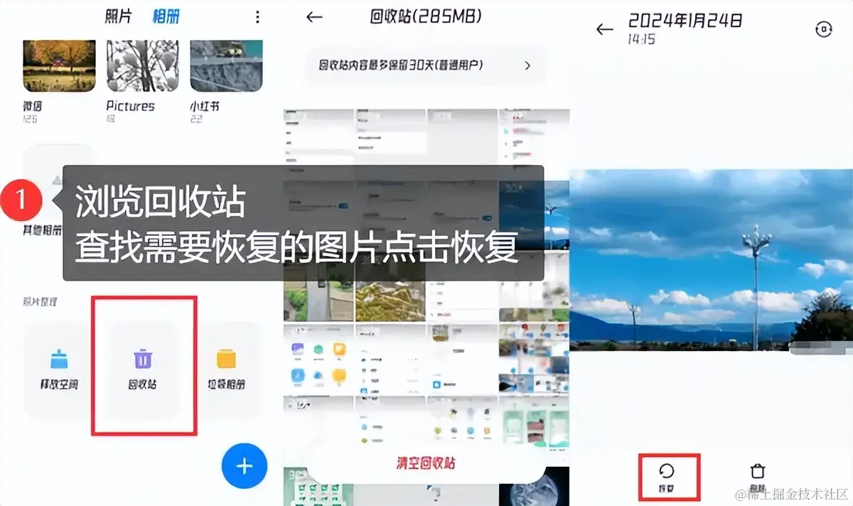 许多手机操作系统都提供了回收站功能,允许用户在一定时间内恢复删除的文件,也包括照片。这种方法适用于刚刚误删文件的情况,但并非所有删除的照片都能恢复。通常,删除后超过30天的照片以及部分系统文件删除的照片都无法恢复。我们只需要打开手机相册,找到“已删除”或“回收站”的选项,在里面找到需要恢复的照片并还原就可以了。