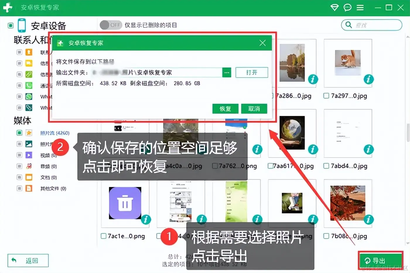 第三步:在可恢复的照片列表中选择照片,选择完成后点击“导出”,根据提示确认保存位置,然后将照片数据恢复到指定位置。