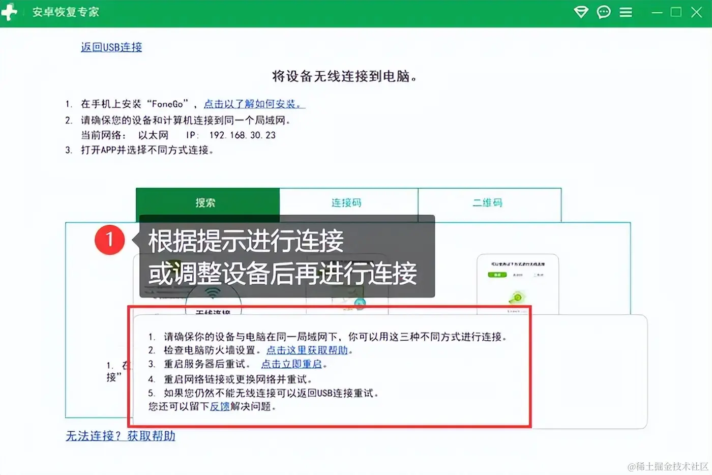 第一步:首先,您需要在电脑上下载并安装,完成后,将手机与电脑连接,确保手机已经符合连接要求,如果没有,可以根据页面的提示进行调整。