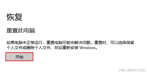 第二步:在左侧菜单中选择“恢复”,在右侧找到 “重置此电脑” 选项,点击“开始”。