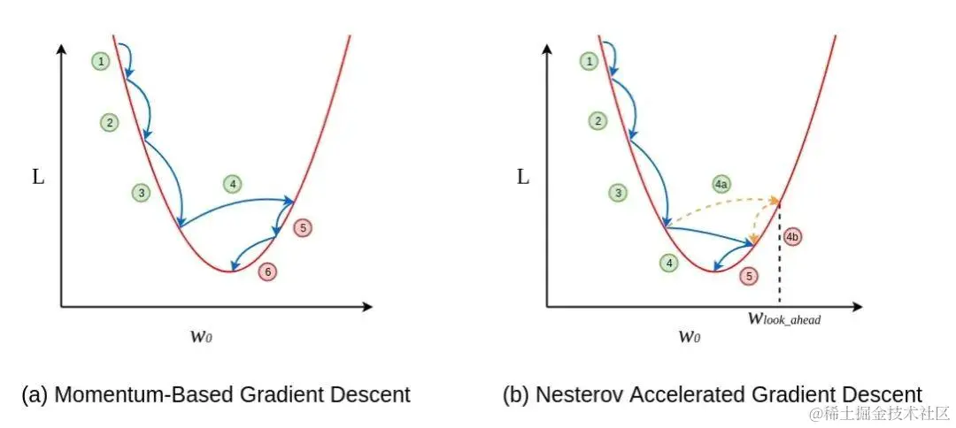 - Nesterov加速梯度下降法(NAG):提供预知能力以调整步长。
