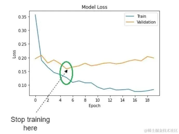 在每个训练周期结束时,计算验证集的损失函数值。如果损失函数在连续若干周期内不再下降或开始上升,则提前停止训练。