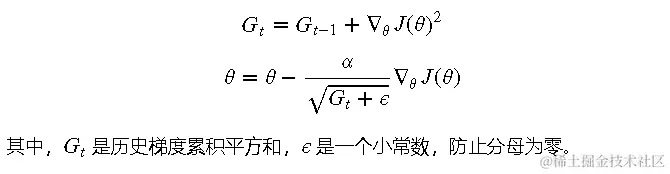 - Adagrad:自适应学习率,适应稀疏数据。