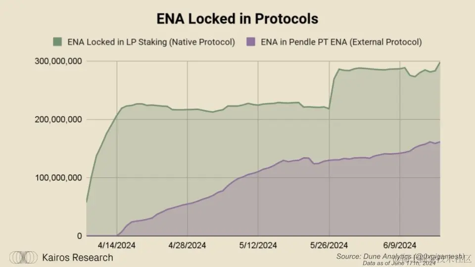 ii) 将 ENA 锁定在 Pendle Finance PT-ENA 内,用户可以以 PT-ENA 的形式获得目前约 75% 的固定年利率,YT-ENA 购买者可以获得积分分配,并且只需持有 1 YT = 1 ENA 即可满足相对于其 USDe 持有量的最低 ENA 持有量。目前,PT-ENA 池持有约 1.6 亿 ENA。