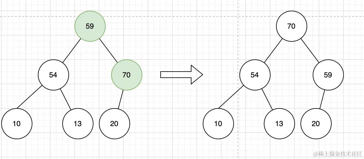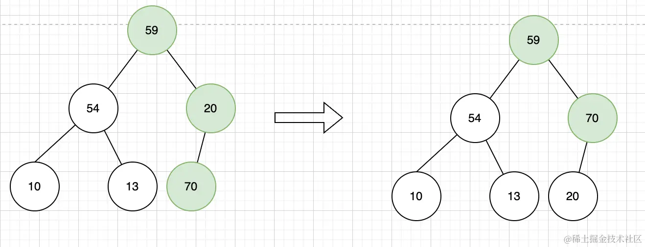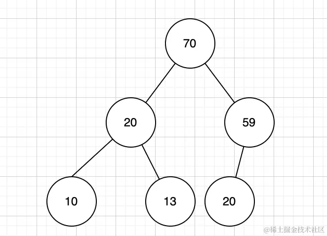 第六步:将70放入20节点的左节点上,发现父节点小于新增的子节点,调整堆结构。