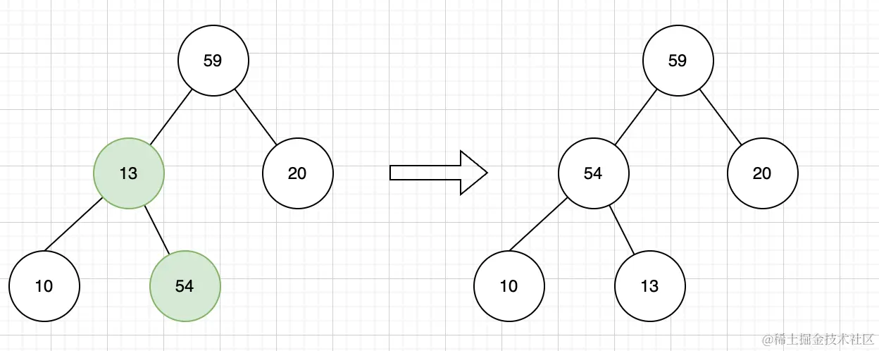 第五步:将54放入13节点的右节点上,发现父节点小于新增的子节点,调整堆结构。