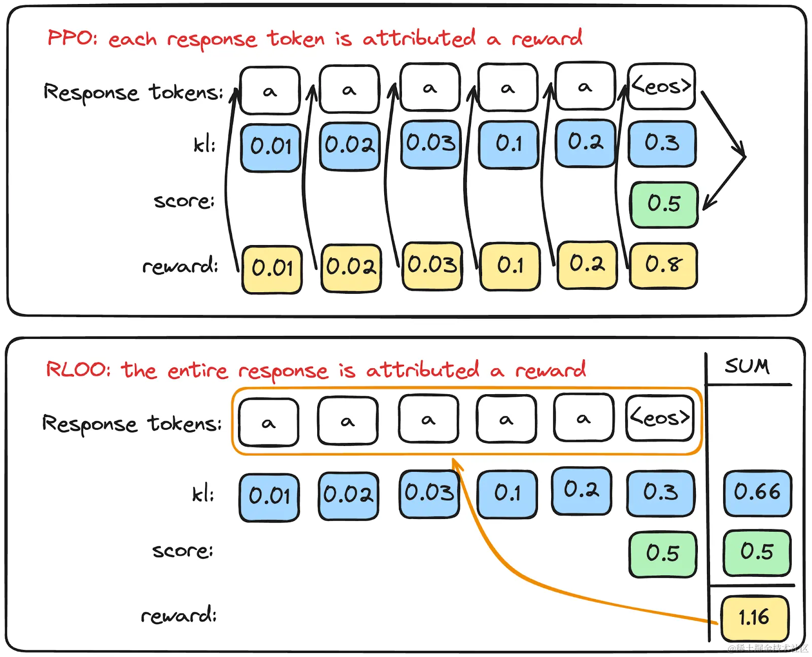 从这里开始,常规的 PPO 和 RLOO 在方法上有所不同。RLOO 有几个关键想法。首先,它将 整个模型补全 视为单一动作,而常规 PPO 将 每个补全 token 视为单独的动作。通常,只有 EOS token 获得真正的奖励,这非常稀疏。常规 PPO 会将奖励归因于 EOS token,而 RLOO 会将 EOS 奖励归因于整个补全,如下所示。