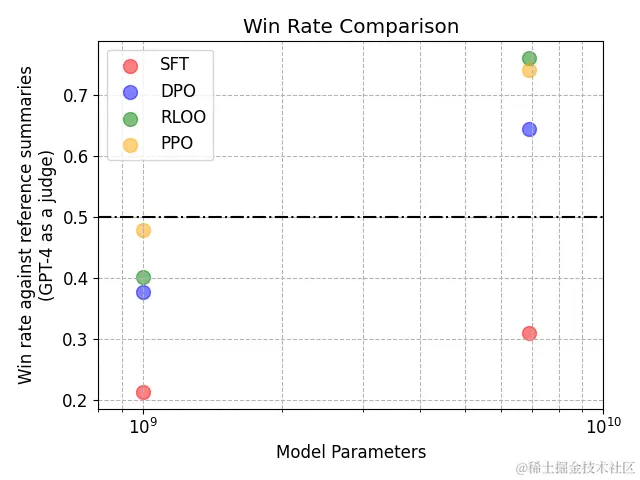 - 🔥在响应胜率 (由 GPT4 判断) 方面,RLOO 与 PPO 相当,并且始终优于 DPO 等流行的离线方法。