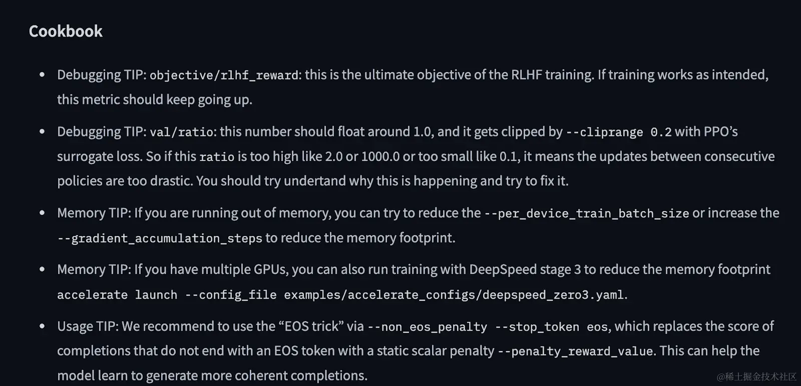 在编写 RLOO 和 PPOv2 实现时,我们强调使模型开发的透明度更容易提升。特别是,我们已经增强了文档,包括对记录指标的解释以及阅读和调试这些指标的操作指南。例如,我们建议在训练期间密切监控 objective/rlhf_reward,这是 RLHF 训练的最终目标。