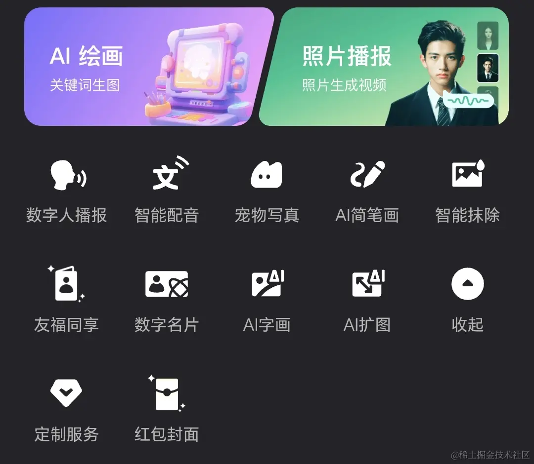 功能:AI 生图(内测中)、制作商品图、制作海报、制作艺术字、图片扩展、图片变高清、涂抹消除、涂抹编辑、图片叠加、人物动作识别再创作(VIP)、线稿识别再创作(VIP)、自定义模型(VIP)