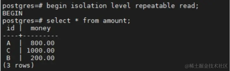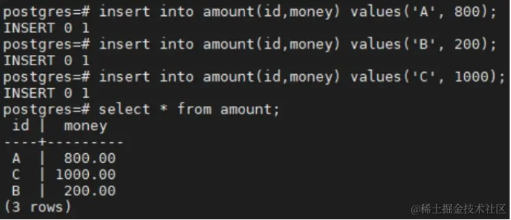 insert into amount(id,money) values('A', 800);