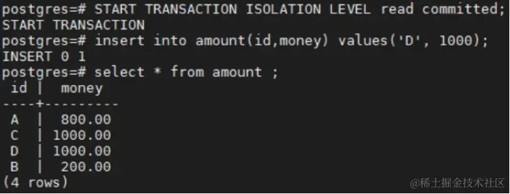 开启session2查询数据,只能查到前3行,未提交的D查不到: