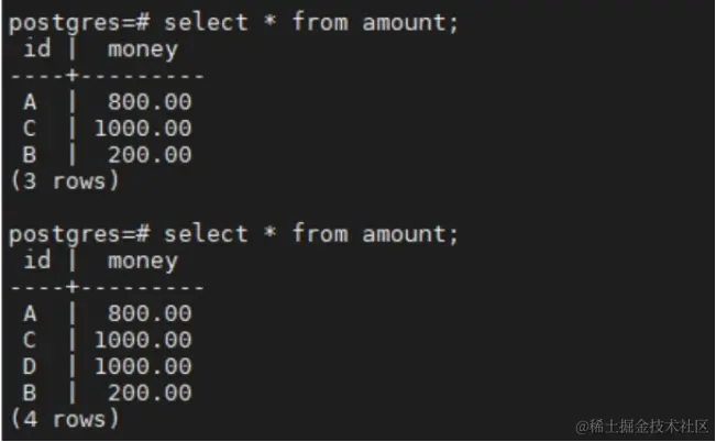 insert into amount(id,money) values('C', 1000);