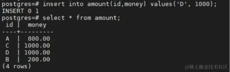 insert into amount(id,money) values('D', 1000);