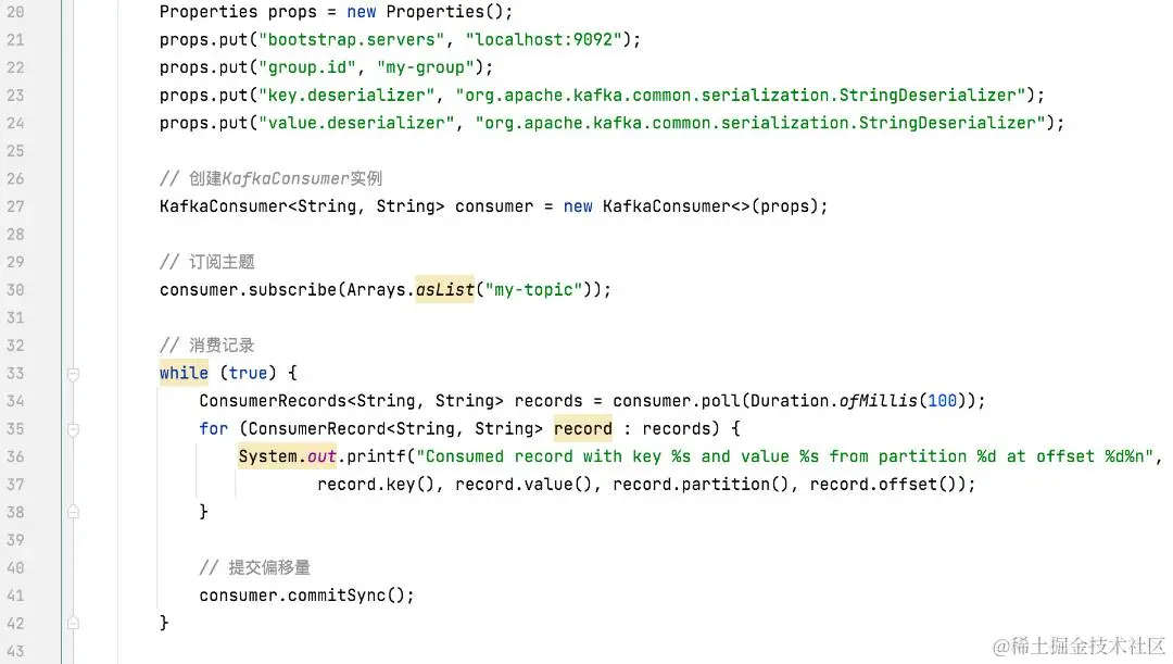 在这个例子中,我们创建了一个KafkaConsumer实例,订阅了主题my-topic,并循环拉取记录进行处理。处理完成后,我们手动提交偏移量,确保处理进度得以保存。