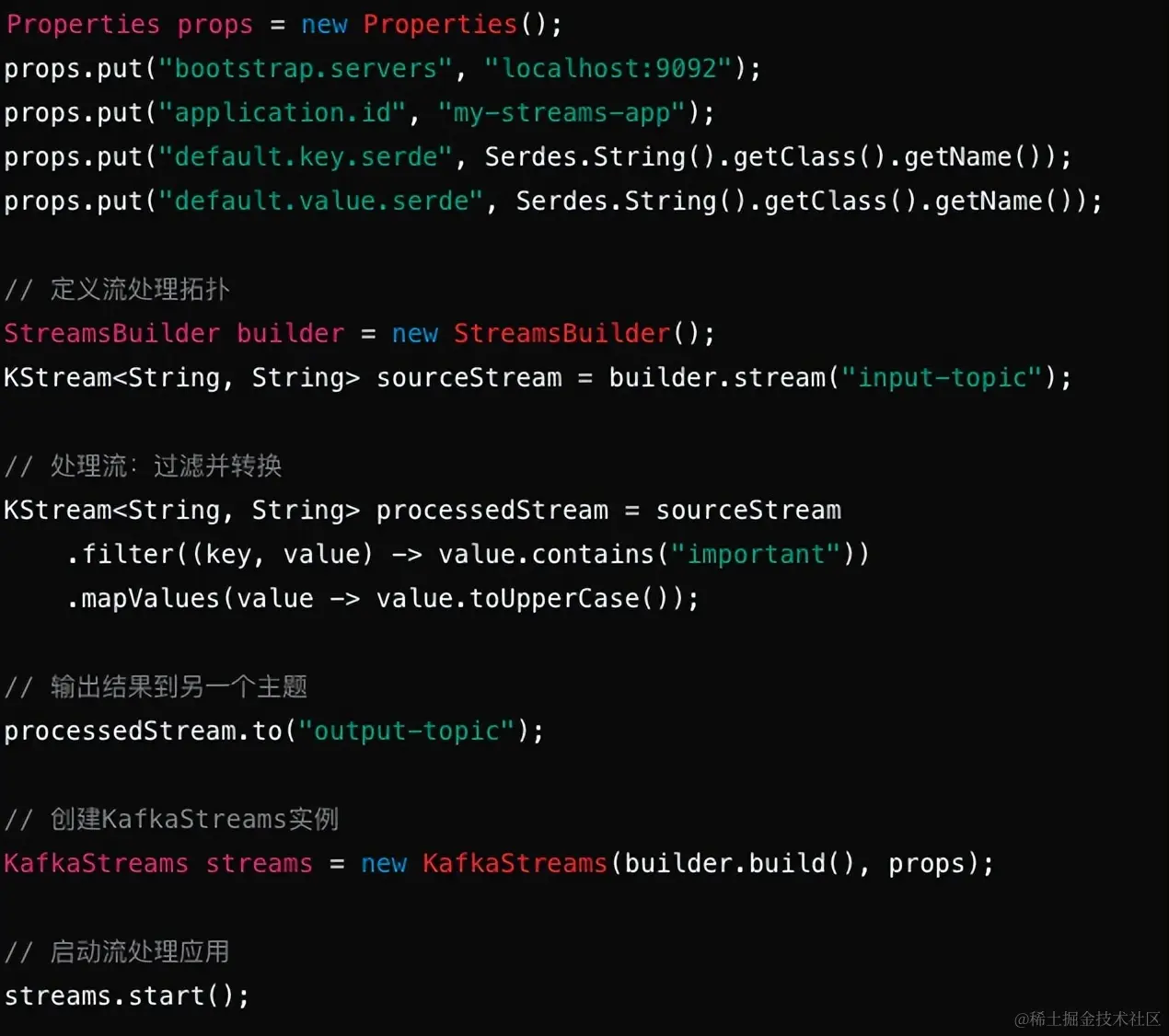 使用Streams API,我们需要创建一个KafkaStreams实例,并定义流处理拓扑。下面是一个简单的例子: