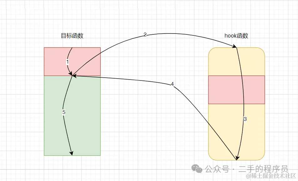 对于被覆盖的指令,我们将其放入hook函数中执行,对应图中的红色部分,这里会遇到非常多的问题,有兴趣的自行查找资料。